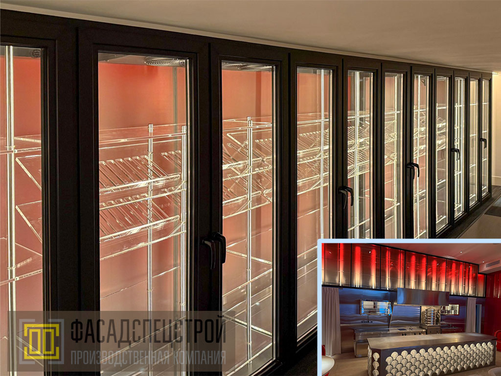 Специалисты «ФасадСпецСтрой» изготовили и установили остекление для винного шкафа/холодильника в ресторане с чистовой отделкой.